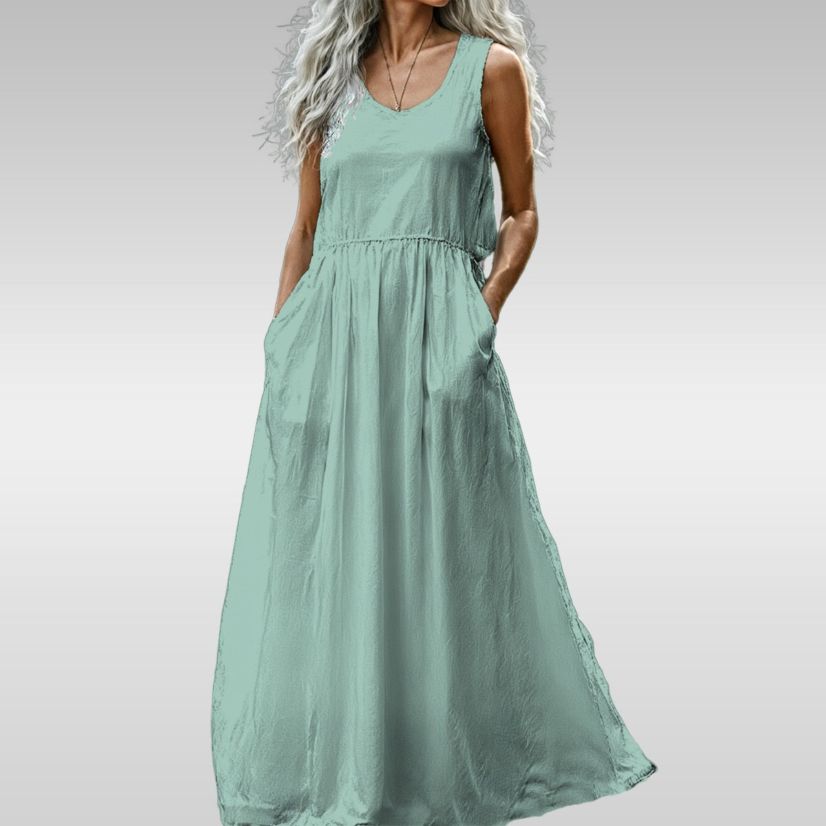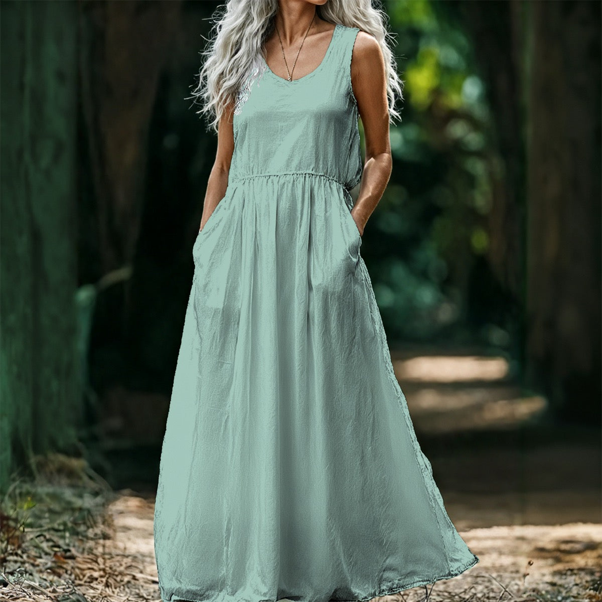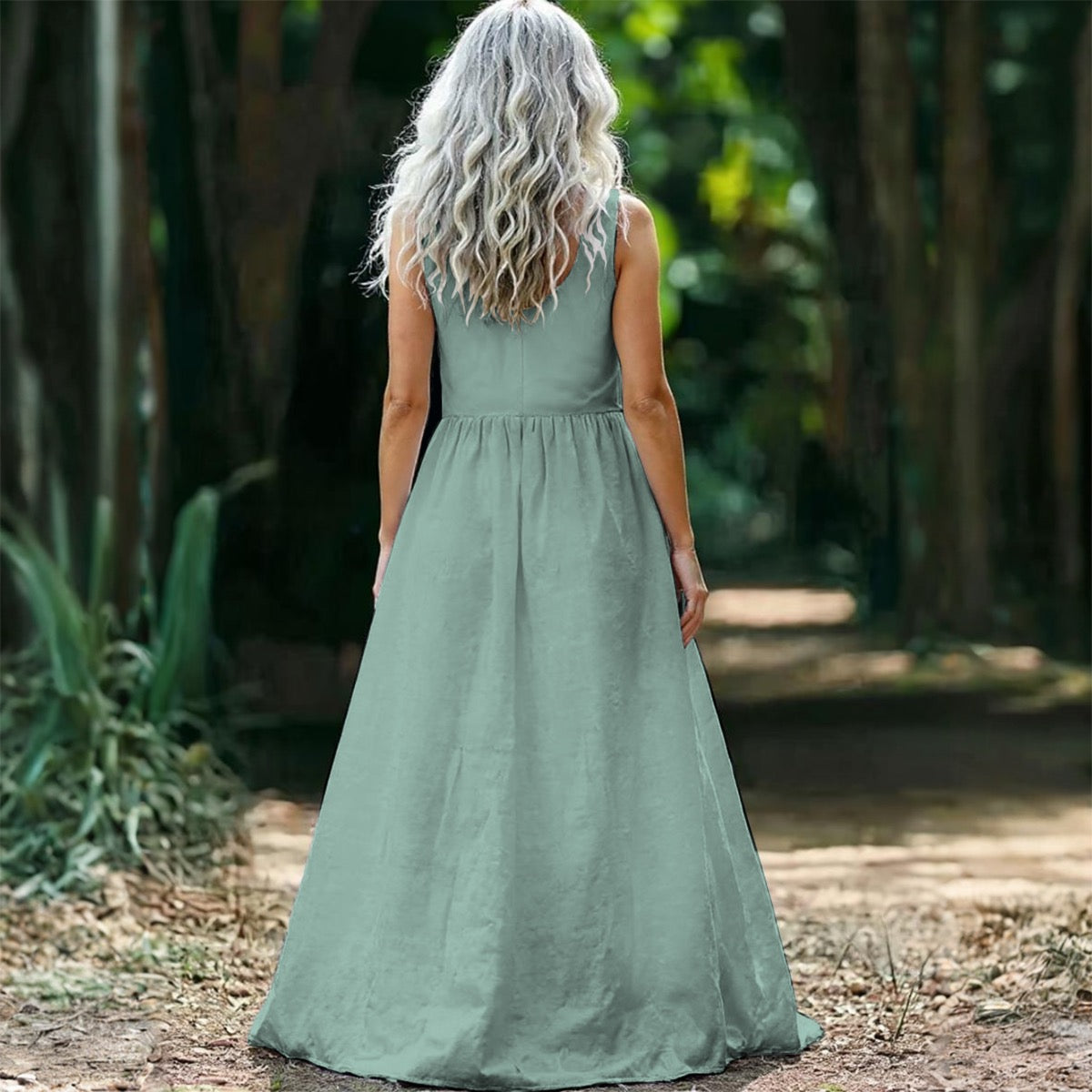 This sleeveless maxi dress is made from lightweight 140G polyester fabric, offering a smooth, breathable feel that's ideal for spring and summer. The design features a fitted bodice with a high waistline and a gently flared hem, creating a flattering silhouette with graceful flow. The blue-toned tropical leaf print adds a vibrant, refreshing touch, making this dress perfect for casual outings, vacations, beach walks, or garden parties.