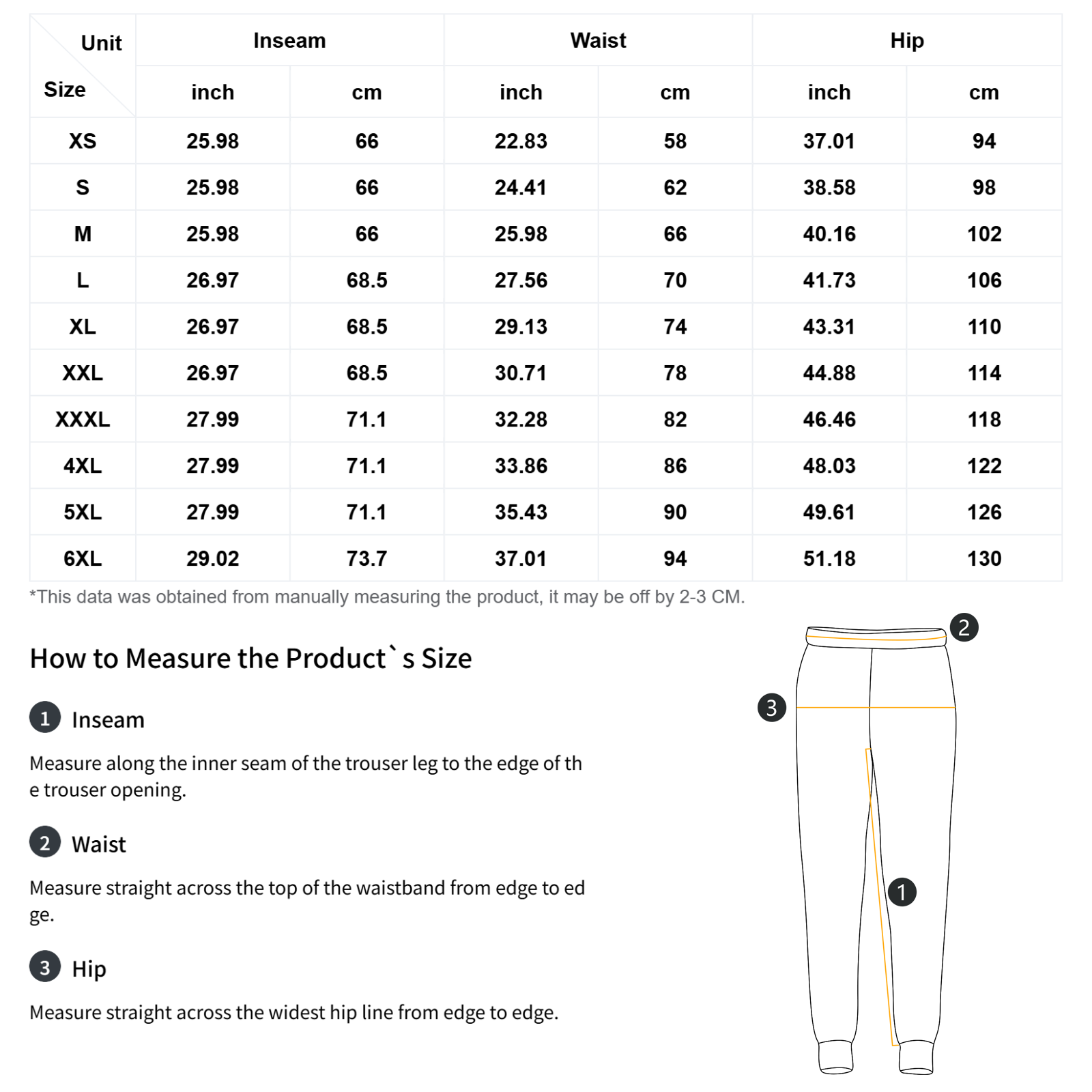 | Size | Inseam | Waist | Hip |
