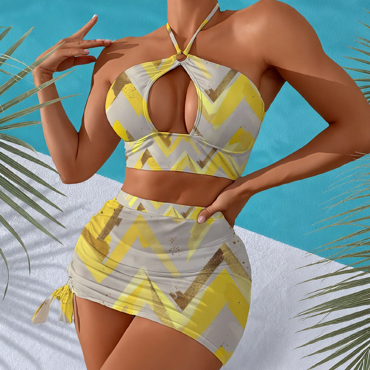 Make a statement in this stunning swimsuit, featuring a backless, cross-front cropped top and an asymmetrical pleated skirt. The fitted silhouette flatters your curves. Whether you're heading to a night out, a beach party or on vacation, this outfit effortlessly combines comfort and sexiness. Made from a stretchy, soft polyester-spandex blend, this piece offers both mobility and support. The pleated skirt has side drawstrings so you can adjust the length for your ideal look.