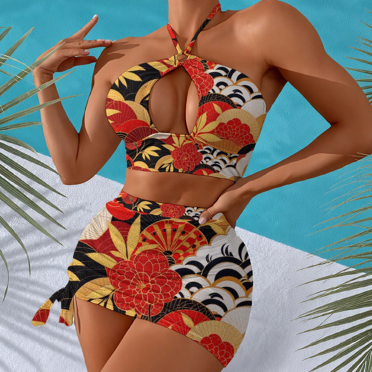 Make a statement in this stunning swimsuit, featuring a backless, cross-front cropped top and an asymmetrical pleated skirt. The fitted silhouette flatters your curves. Whether you're heading to a night out, a beach party or on vacation, this outfit effortlessly combines comfort and sexiness. Made from a stretchy, soft polyester-spandex blend, this piece offers both mobility and support. The pleated skirt has side drawstrings so you can adjust the length for your ideal look.