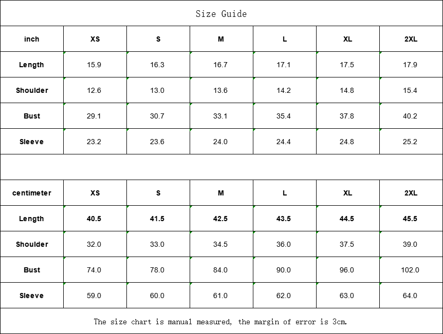 | Sleeve | 23.2 | 23.6 | 24.0 | 24.4 | 24.8 | 25.2 |