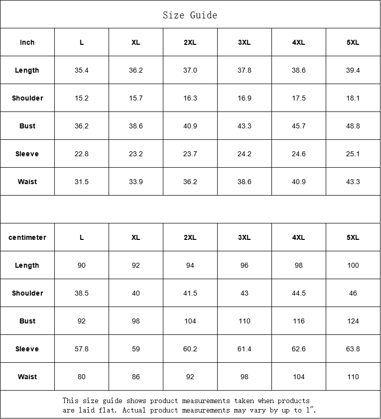 | Inch | L | XL | 2XL | 3XL | 4XL | 5XL |