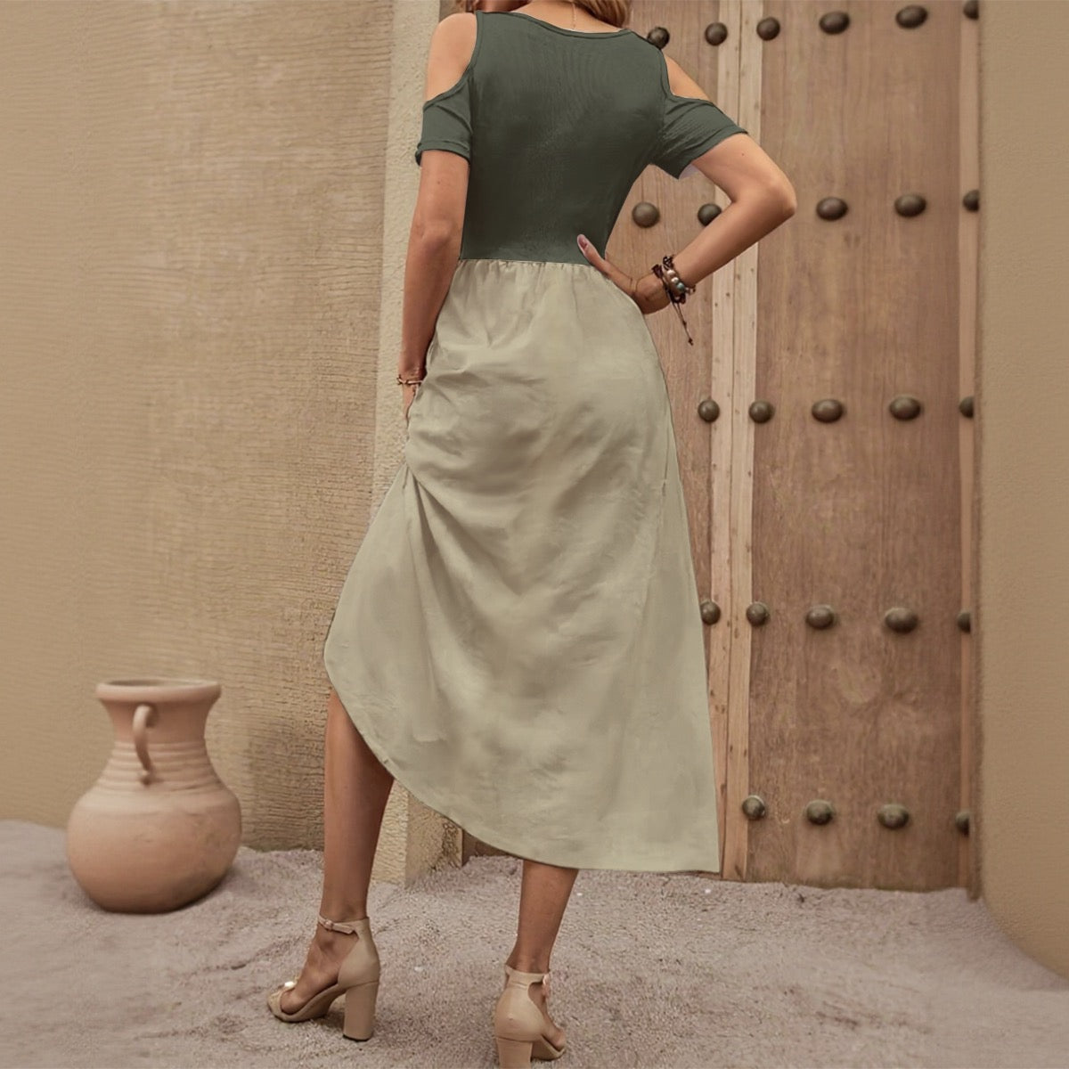 Experience effortless elegance in our off-the-shoulder maxi dress, the perfect blend of comfort and style. Made from high-quality, lightweight and soft fabric, this dress is designed to keep you cool and comfortable while looking fabulous all day long. The fitted V-neck and sleek, off-the-shoulder short sleeves flatter your shoulders for a feminine, modern silhouette. The high-rise cut, slightly nipped in at the waist, and draped at the hem for a fitted, figure-flattering drape without sacrificing comfort.