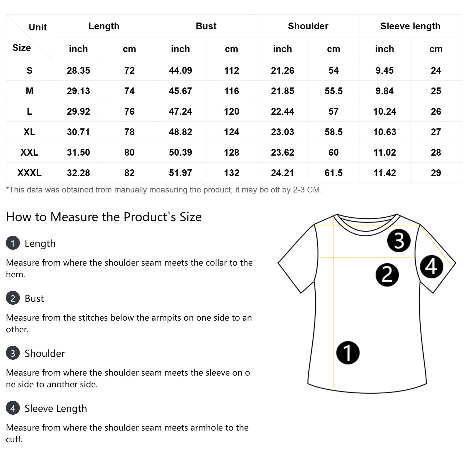 The measurement data of this size is obtained by laying clothes flat. Due to different measurement methods, it is normal that the error is within 2-3cm.
