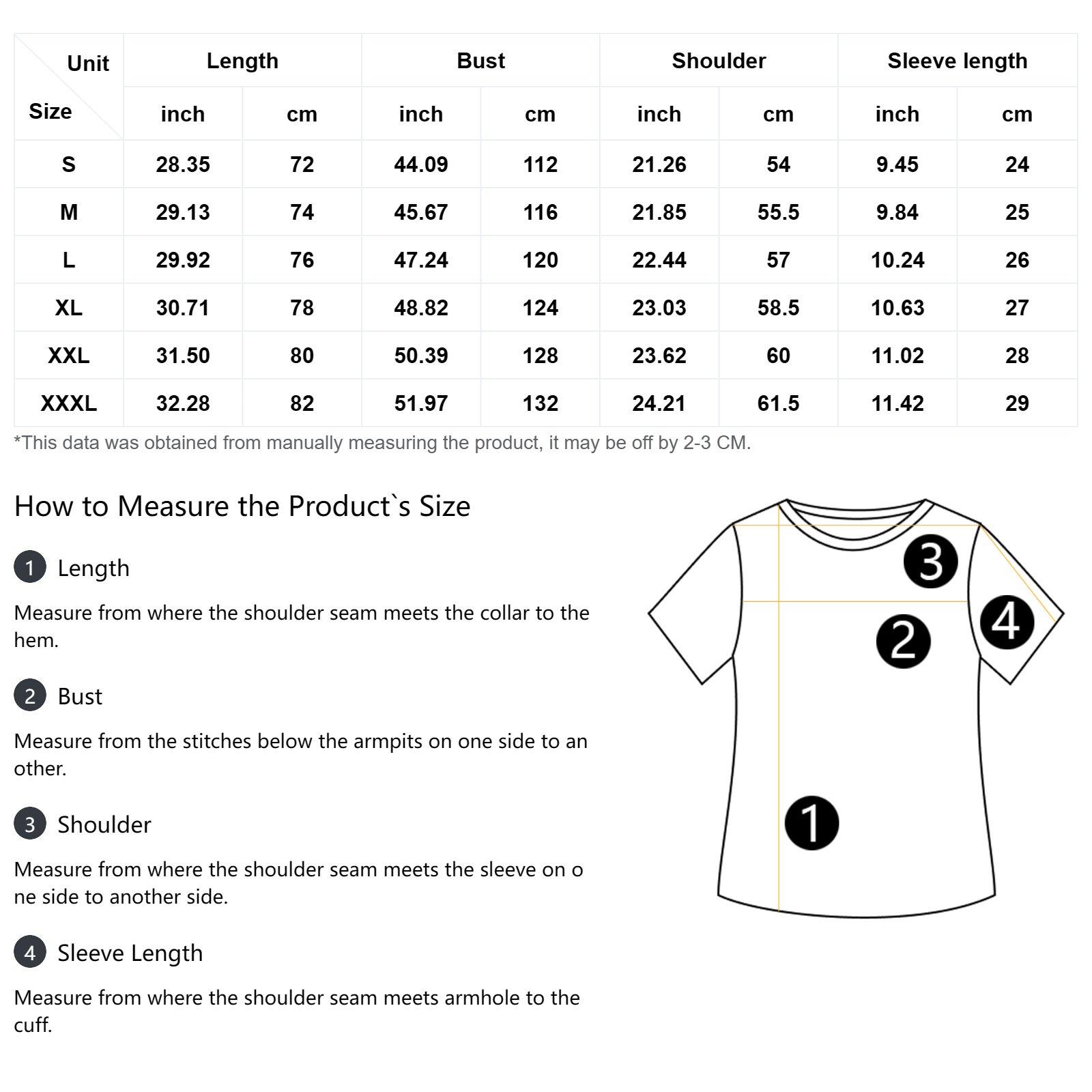 | Size | Length | Bust | Shoulder | Sleeve length |